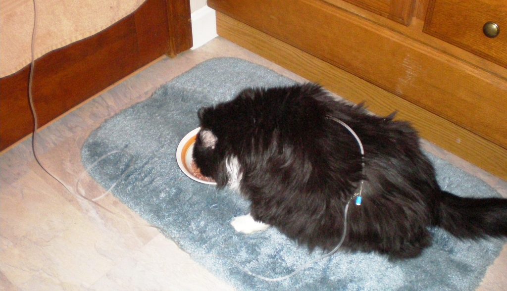 One reader asked me to mention that if your cat wears a collar and you give fluids nearby, you need to make sure the collar does not become uncomfortably tight as a result.