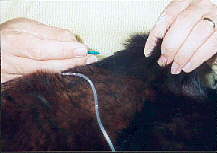 You will find it easier to inject your cat if you form a good tent (pouch) with the skin. On the left you can see us making a tent on Thomas.